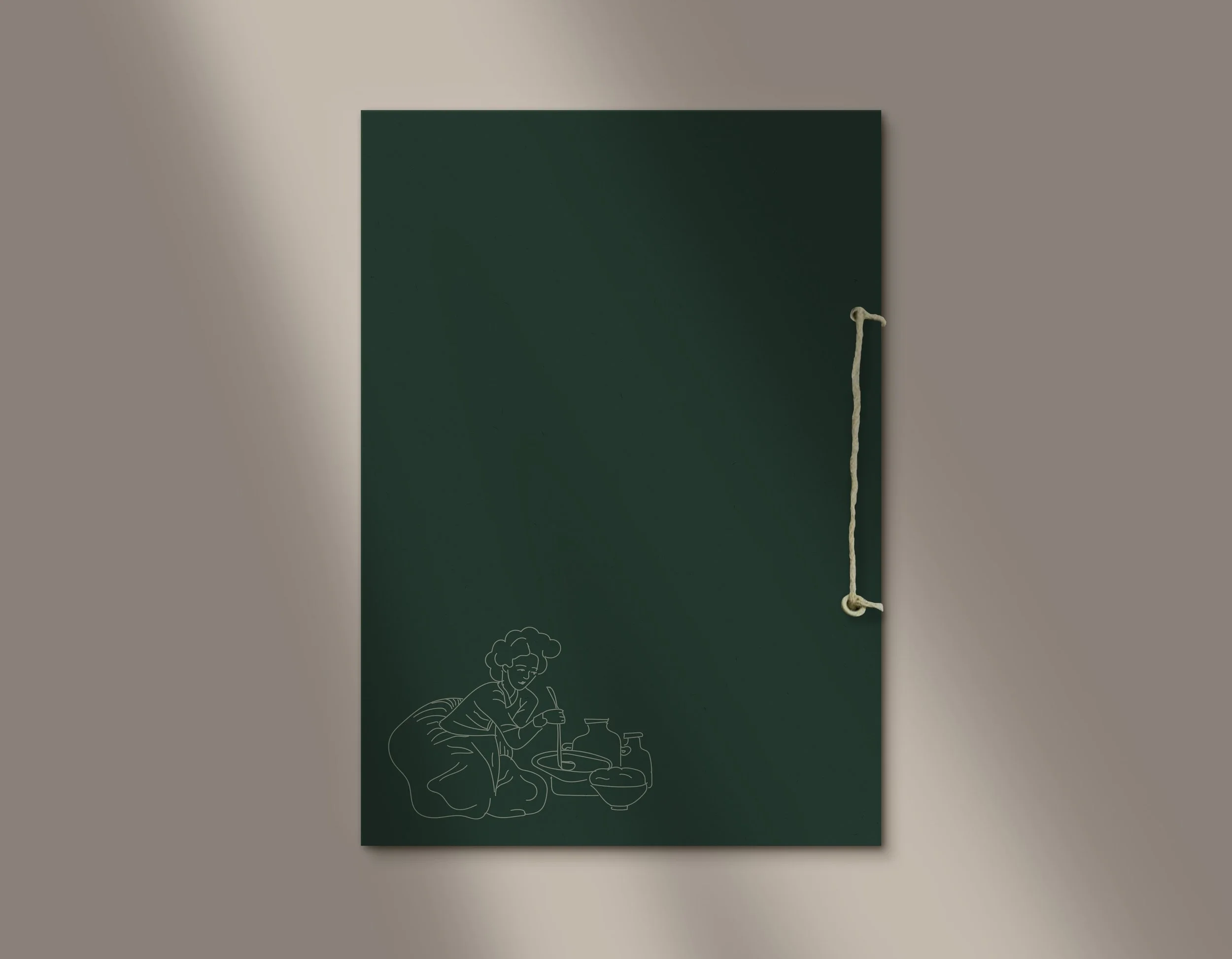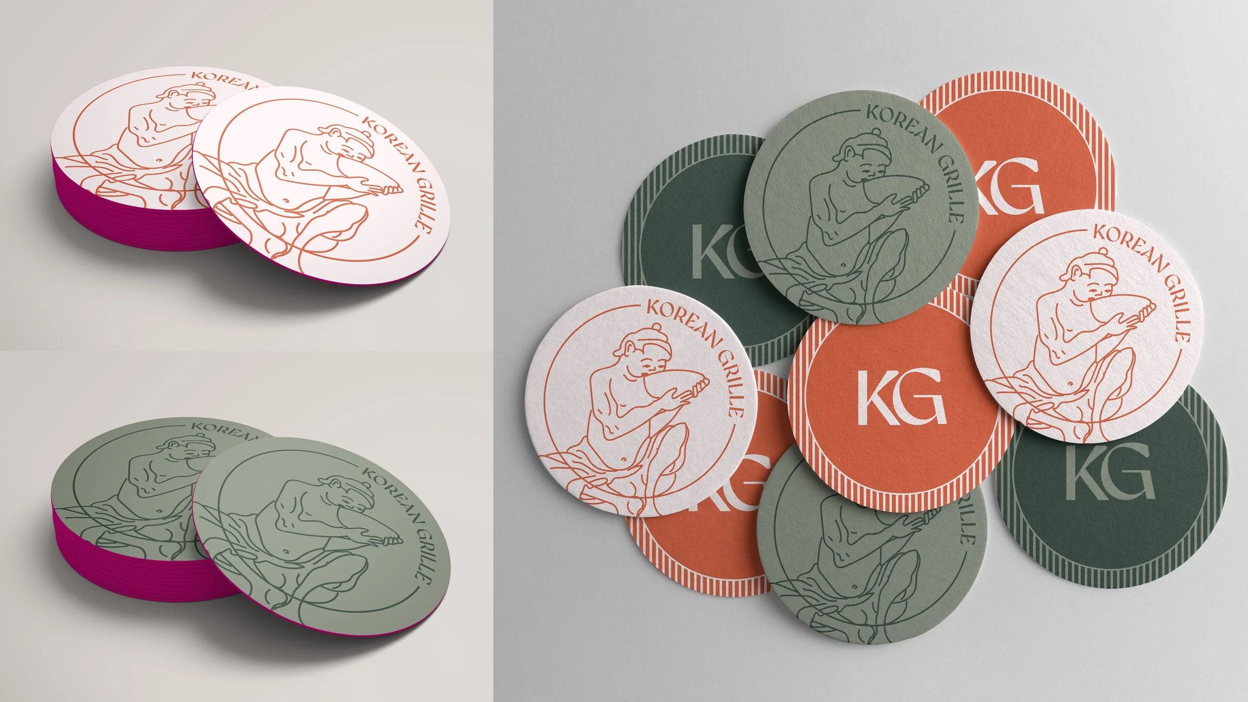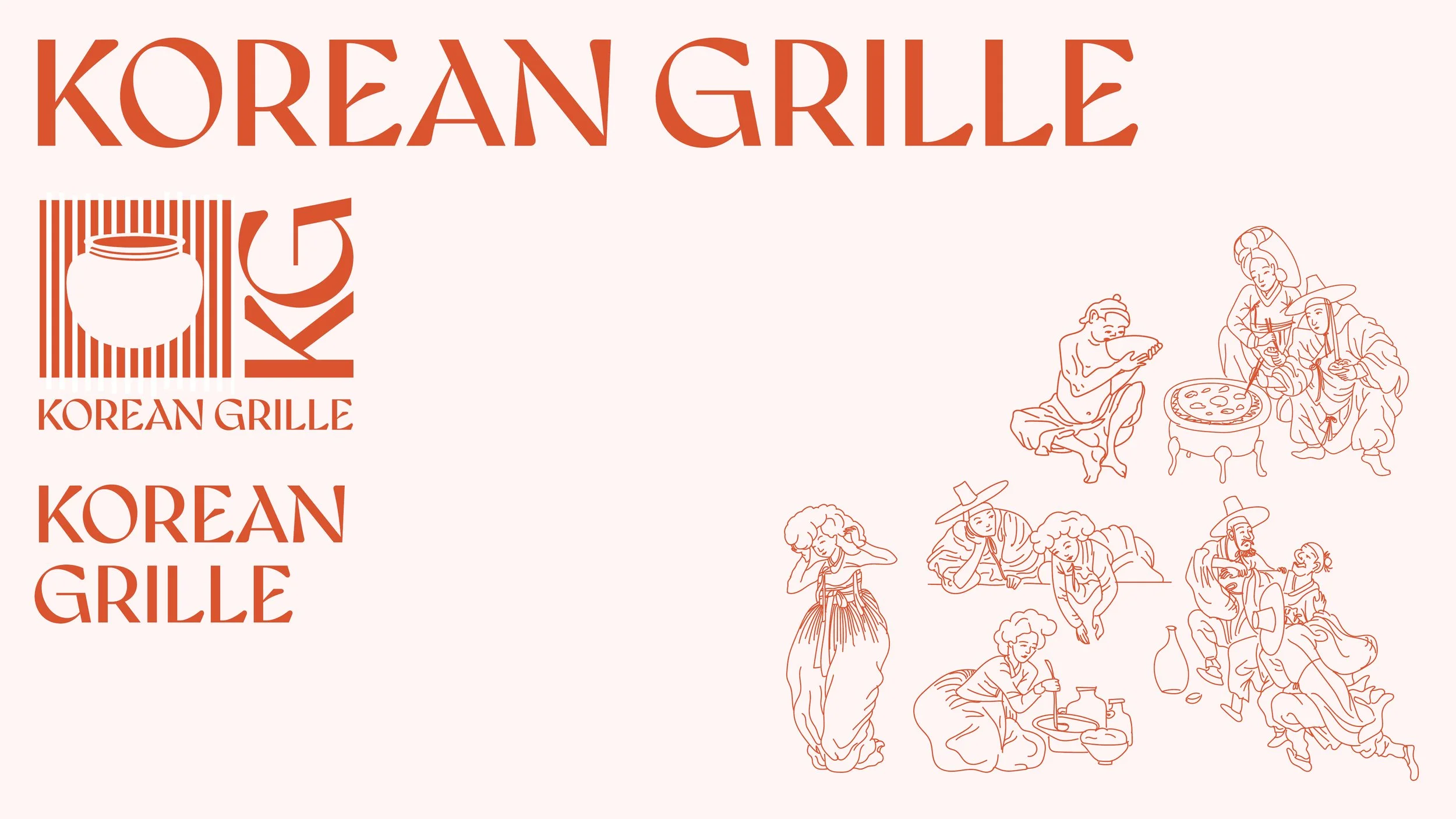 The logotype utilizes the typeface Gyst Variable, and was selected due to the tapered forms within the letters alluding to the essence of the Calligraphy of Hangul characters, but also is implemented in a reserved manor—thus maintaining a sophisticated quality. It is shown here in different iterations that can be used in the system as they apply, along with a cooking pot logomark, and custom illustrated figures derived from traditional Korean paintings.
